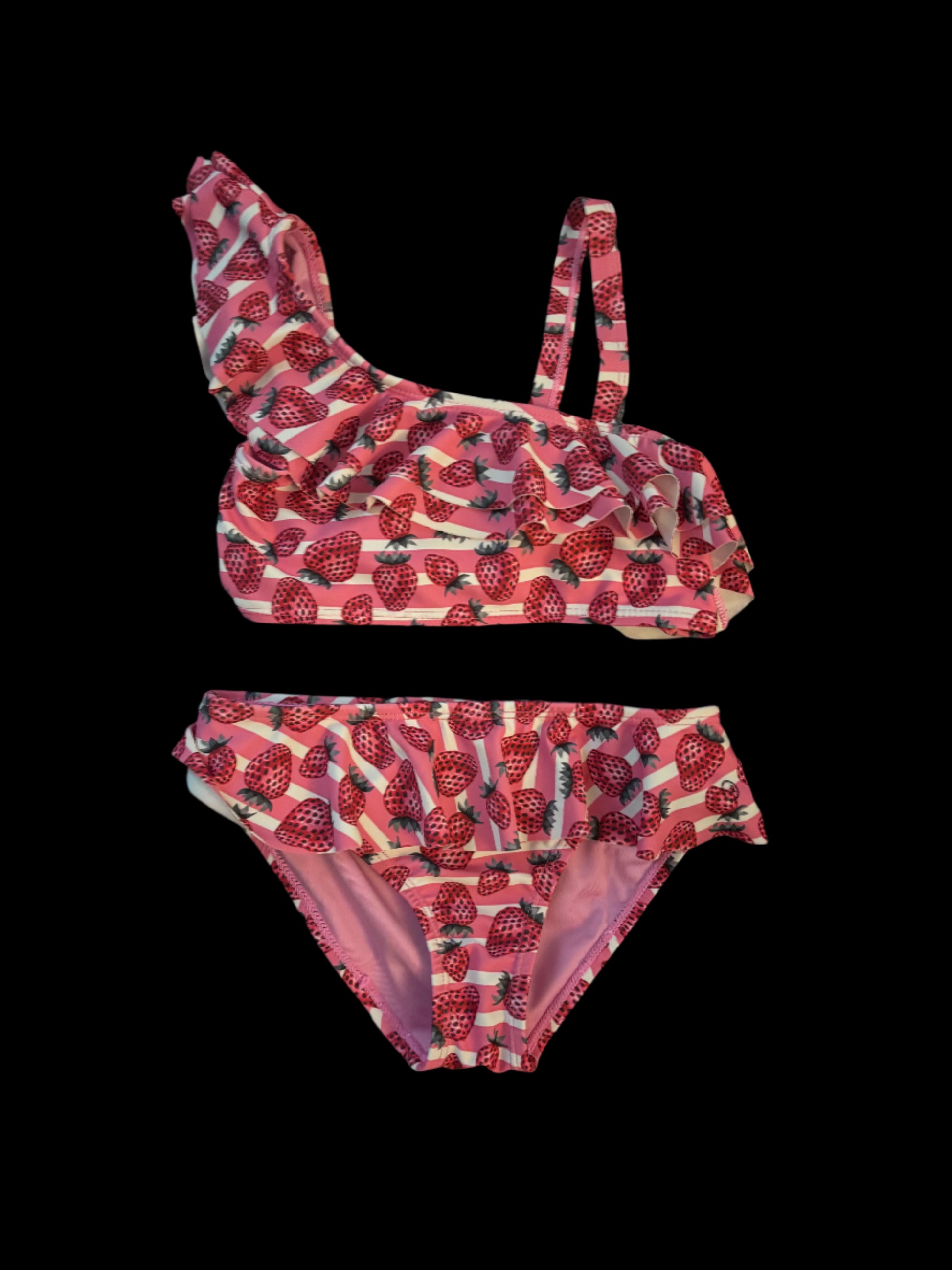 Like new hot pink strawberry-patterned Rip Zone two piece bathing suit for 7/8 year old. Worn once if that - grown out of by the time tried on. Itchy tags removed.